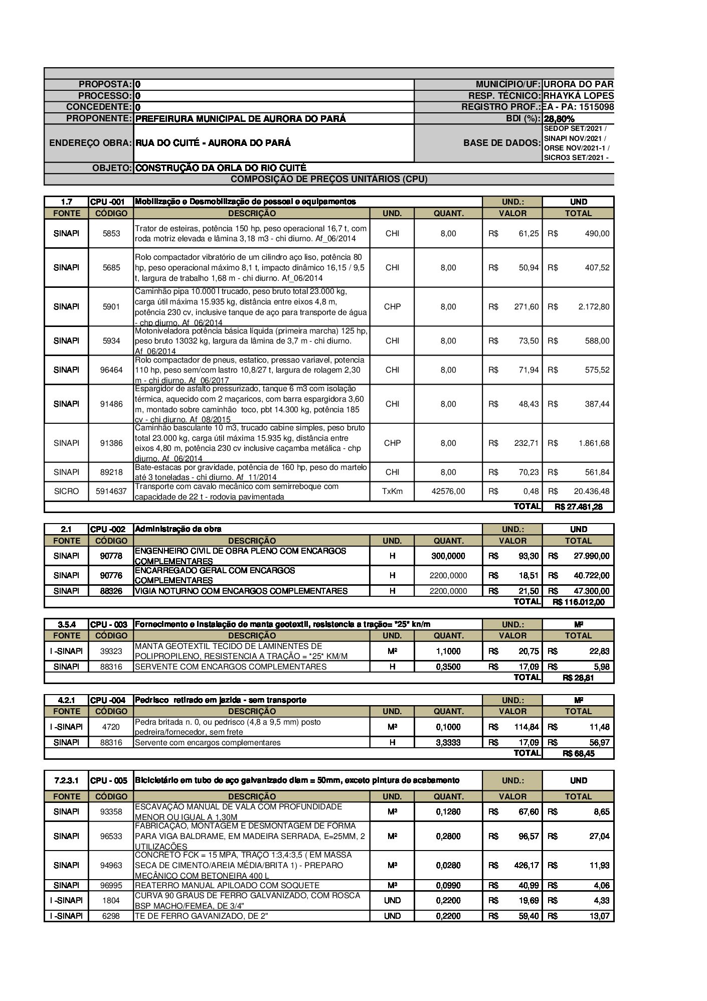 Planilha de composição de custos unitários da Administração